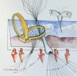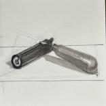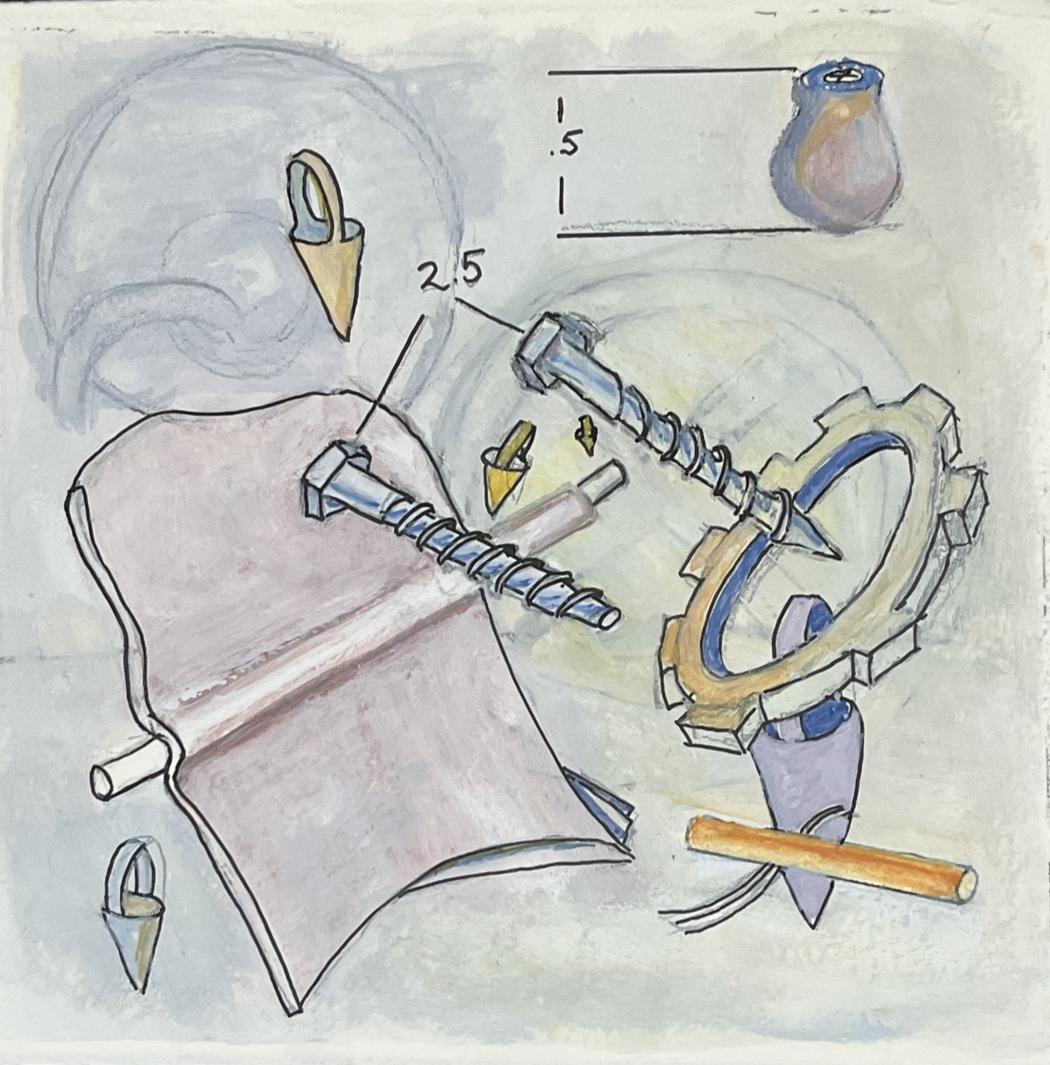 These images switch between realistically depicted everyday tools and those same tools deconstructed and rearranged with fanciful introductions of pseudo scientific/math notations which seem to mean something but really do not.