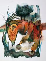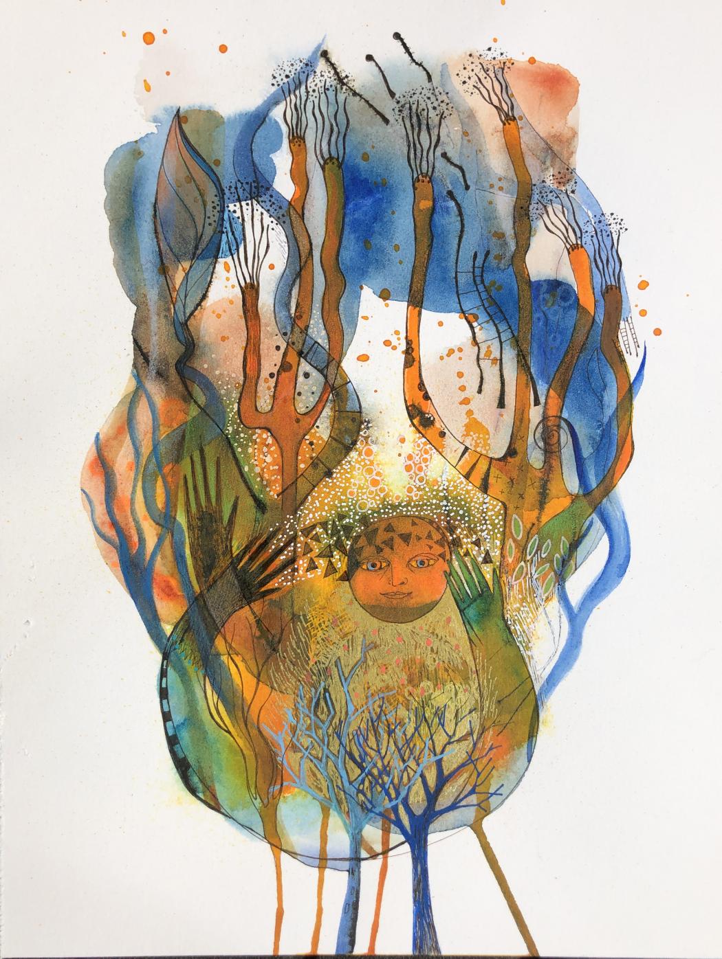 The big-picture perspective afforded by my recent investigation of deep geological time and paleobotany encourages me. Supernatural beings and spirits of all ethnicities are welcome in my work as a visual storyteller. I am especially invested in interpreting the myths of matriarchal cultures. The resilience of our lovely Mother Earth, our interbeing with all phenomena - all our beautiful impermanence - is what I paint about.