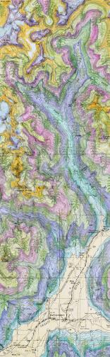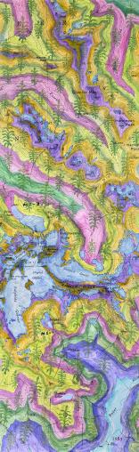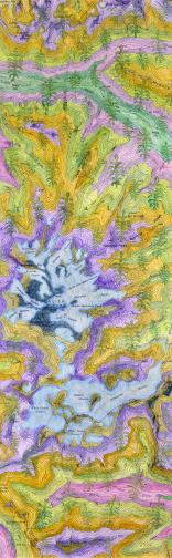Image is one scroll from an installation of 8 scroll maps, 12 images of flora and fauna and quotation essay, a contemplation on the difficulties in our present peril of Skagit instability. Climate changes in the Skagit River ecosystem result from erosion; fluctuation in meltwater and biocenosis historically alter glaciers.