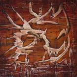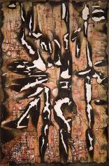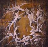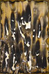 “My process begins by creating spontaneous, mixed-media surfaces. Then I excavate the elusive and symbolic meanings of these haphazard shapes and gestural renderings. My Pyrophyte series begins with marks on raw canvas, which are ignited with fire to produce scorched and burned-through spaces. Acrylic and collage elements achieve the final composition. In nature, pyrophytes are plants, including trees that have adapted to tolerate fire.
