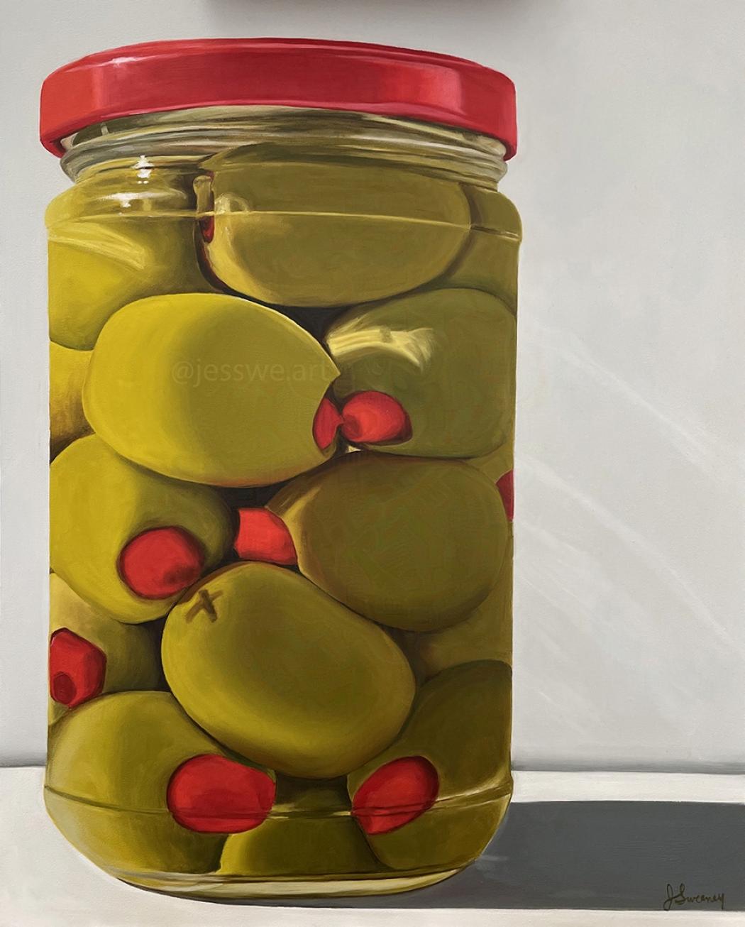 I spotted this jar of chili stuffed olives at the grocery store and couldn't walk past it. The red lid, shapes distorted through glass, the briny promise inside. I brought it home and posed it in the July sun. Olives are a childhood memory I still return to often.