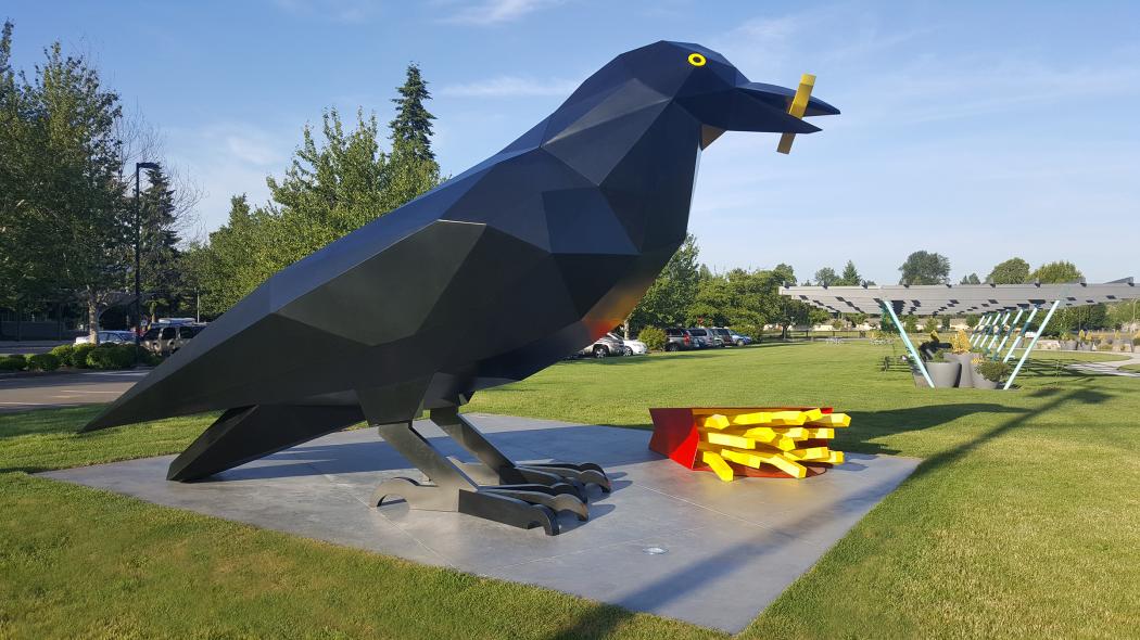 Crow With Fries celebrates the park's many resident crows and recalls the Big Daddy's Drive-In restaurant that once stood at this location.