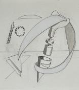 These images switch between realistically depicted everyday tools and those same tools deconstructed and rearranged with fanciful introductions of pseudo scientific/math notations which seem to mean something but really do not.