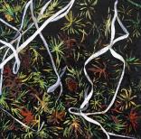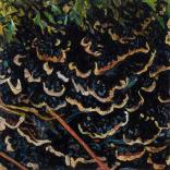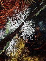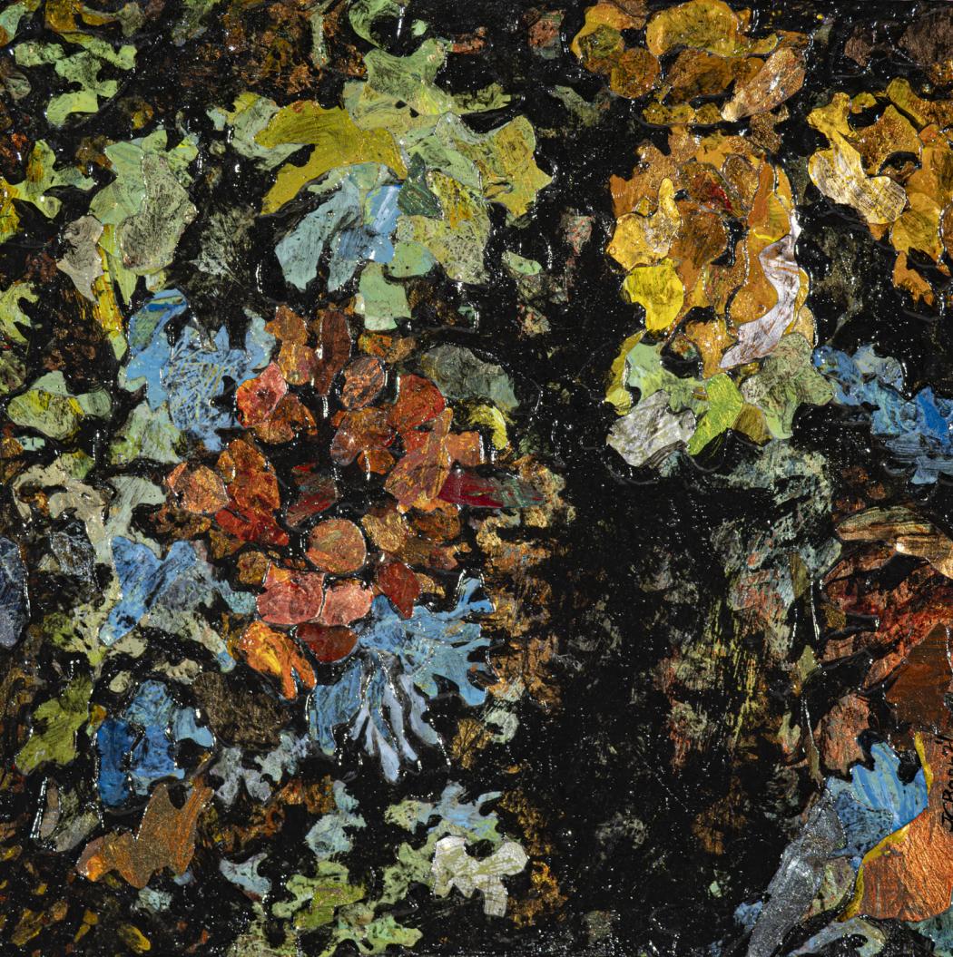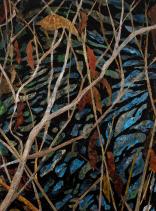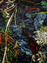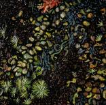 My work reflects my close observation of small-scale native landscapes throughout their tidal and seasonal cycles. Working abstractly, yet anatomically accurately, I try to surprise viewers with unusual views to induce them to discover the complex design inherent in nature. Due to heavily collaged mixed-media elements, the paintings are highly topographical, as though life forms grow out from their surfaces. Compositions tend to lack traditional focal points, thus reflecting the mobile, momentary, sometimes disorienting way we encounter nature.